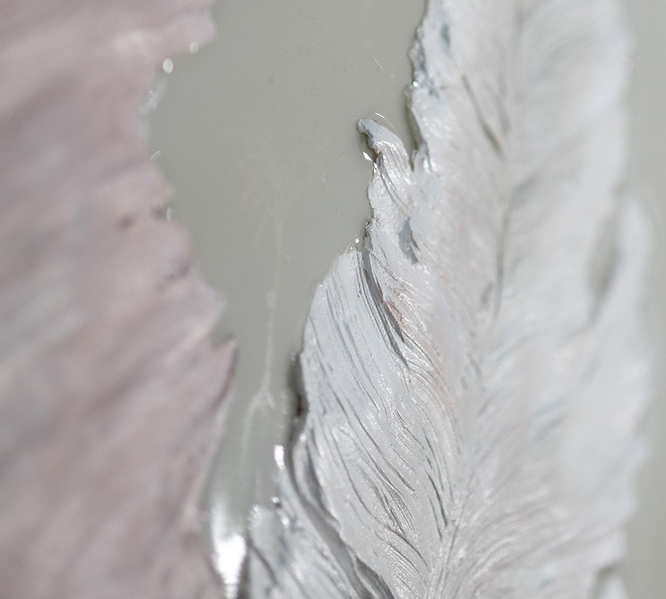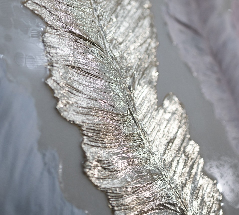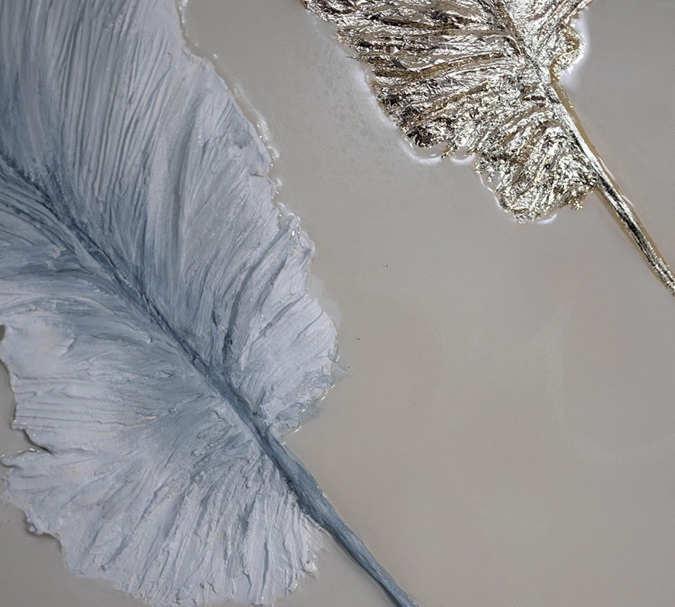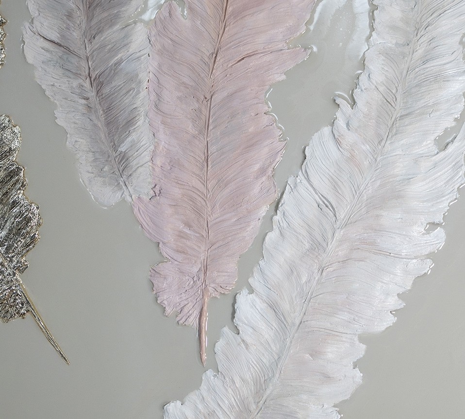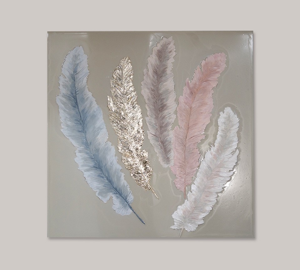 Эта картина передаёт ощущение невесомости и гармонии. Пять изящных перьев, выполненных в нежной пастельной палитре с золотистым акцентом, словно парят в воздухе, создавая атмосферу лёгкости и умиротворения. Тонкие текстуры и игра света на поверхности делают каждое перо уникальным, придавая им живость и объём.