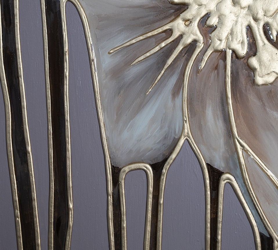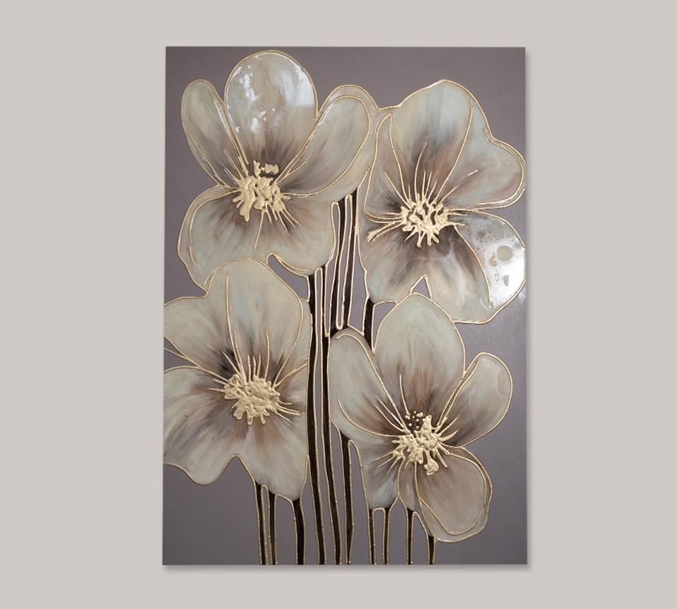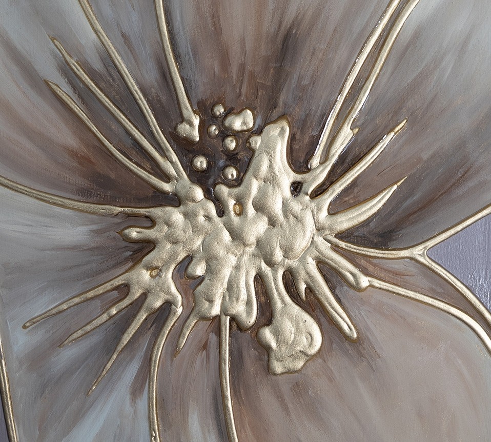 Плавные линии лепестков, выполненные в нежной палитре, передают утонченность и легкость, а золотые детали добавляют роскошный акцент, наполняя картину мягким сиянием. Композиция отражает нежность и изящество природы, создавая ощущение тепла и умиротворения. Это произведение станет ярким акцентом в интерьере, придавая ему нотки романтики, уюта и элегантности.