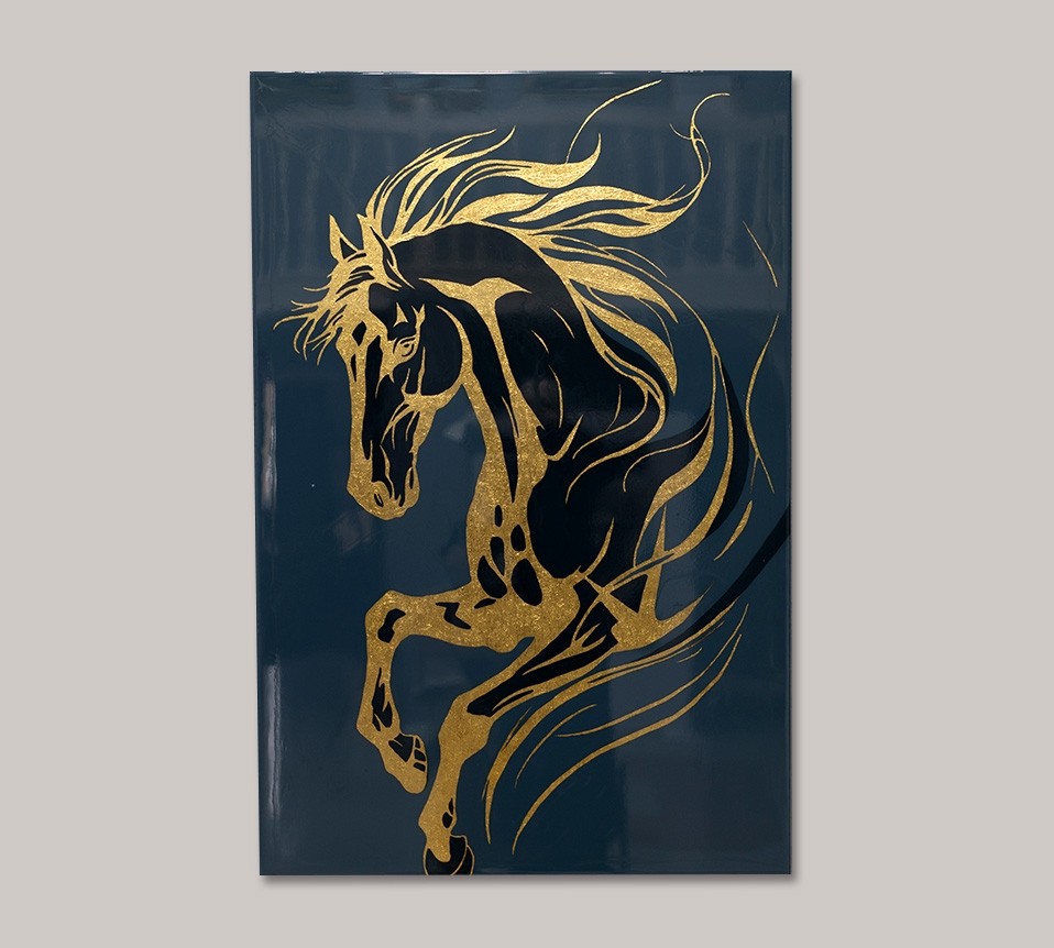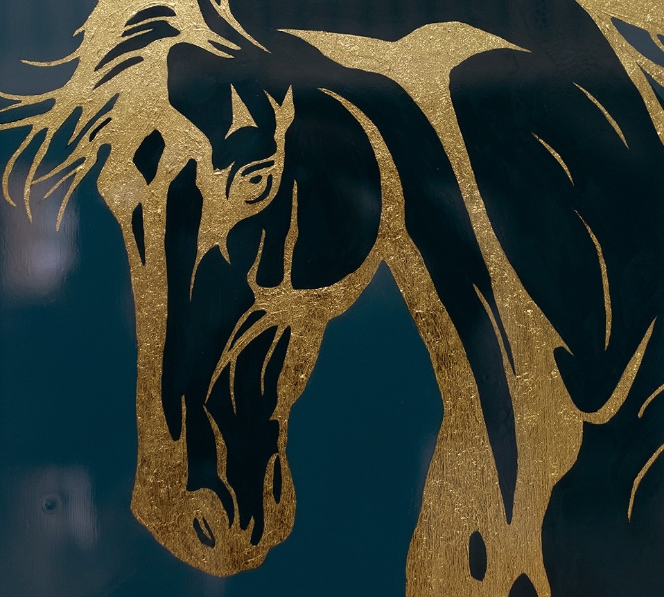 Картина "Бесстрашный" изображает коня, мчащегося навстречу своему хозяину, олицетворяя верность и преданность, которые веками были важной частью горской культуры. Серый фон с синим подтоном создает ощущение сурового климата гор, подчёркивая непростые условия жизни, в которых конь служил людям. Его изображение в золоте символизирует храбрость и огненное сердце, готовое всегда быть на службе своему любимому хозяину.