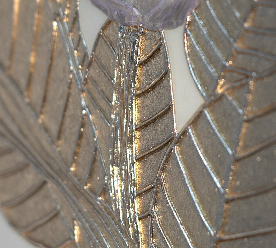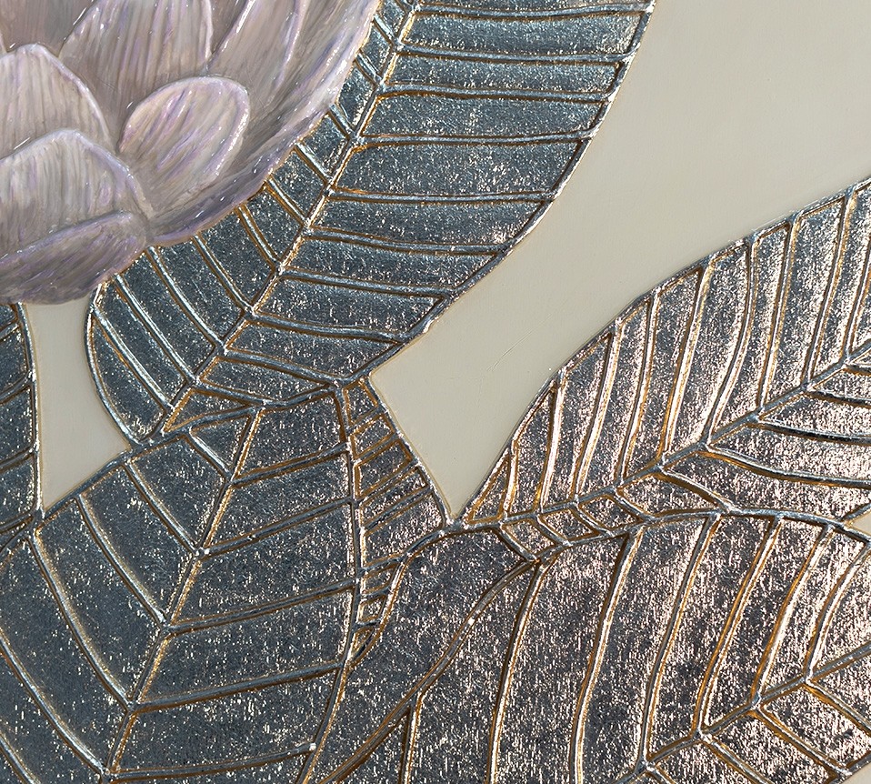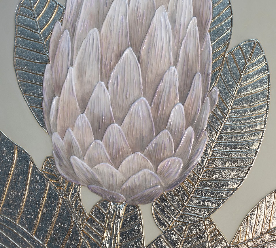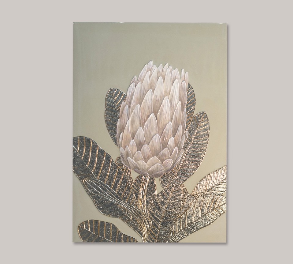 В этой работе протея изображена с использованием потали вместо традиционного зелёного цвета листьев, что придаёт ей изысканность и тепло. Блестящие золотые оттенки создают ощущение роскоши, подчеркивая уникальную природу цветка и делая его центром внимания.