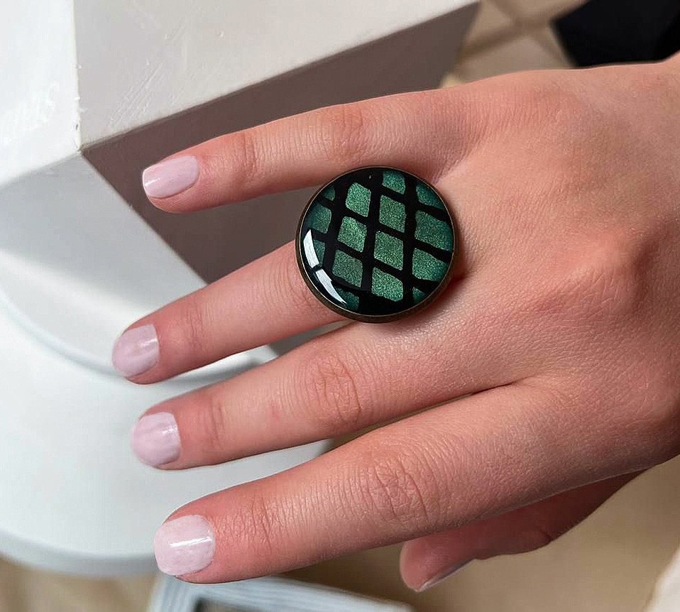Эффектное украшение, в котором глубокий зелёный блеск гармонично сочетается с чёрными линиями. Такое кольцо становится выразительным акцентом любого образа, подчёркивая индивидуальность и неповторимый стиль. Идеальный выбор для тех, кто ценит уникальность и смелость в деталях.