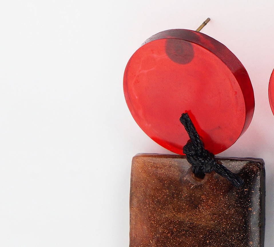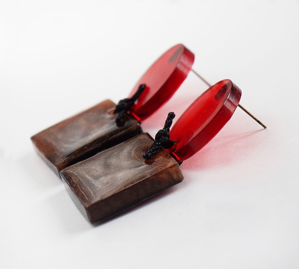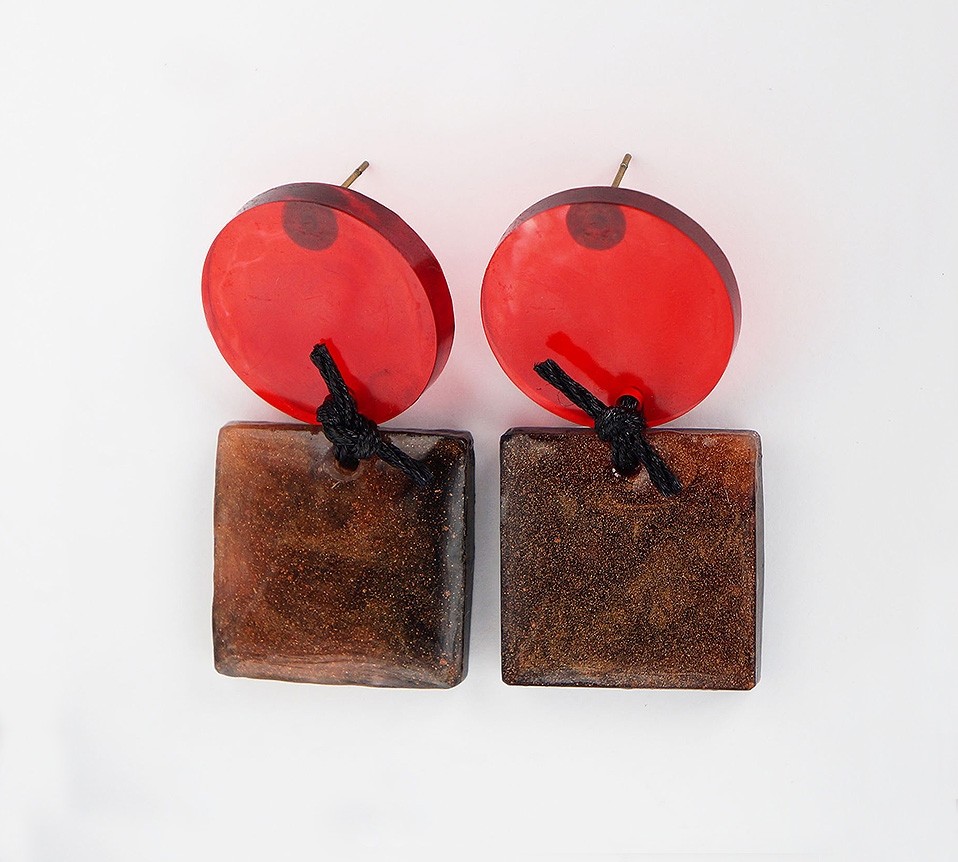 Украшение «Каштановый рубин» — это длинные серьги из двух элементов — прозрачного красного круга и блестящего коричневого квадрата, соединённых чёрной нитью. Такое сочетание оттенков и форм создаёт выразительный и современный акцент, который привлечёт внимание и дополнит любой образ.